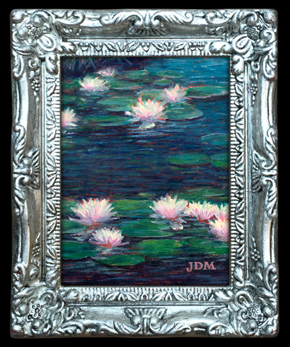 Below are images of some of my miniature paintings. Miniatures are not just small paintings. They are meant to look like a miniaturized version of a large painting. In competition, miniatures are judged with their frame as part of the whole art piece, so I like to show them with their frame. I custom build each frame for my miniatures using old recycled frames that I re-cut, guild, paint, etc. to match the theme of the painting. Some originals are for sale as indicated.